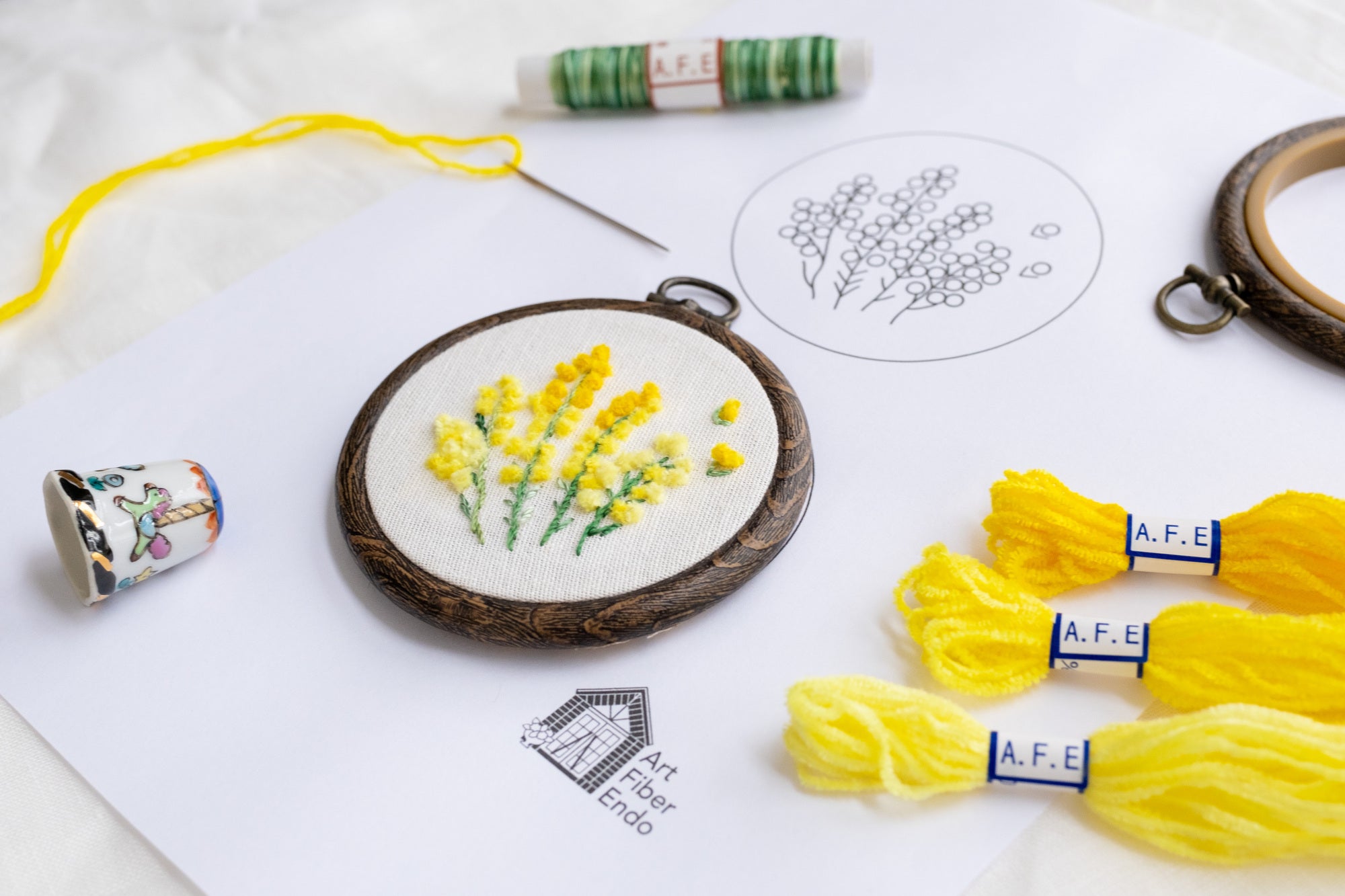 京都・西陣の手芸店【Art Fiber Endo】が染め上げたオリジナルカラーのモール糸を使用する、ミモザの花のフリー刺繍キットです。